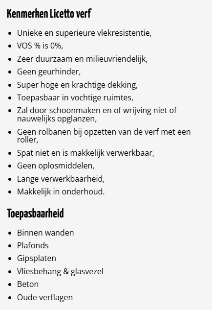 Licetto is een super matte, afwasbare muurverf. Met een egaal matte dekking en super reinigbaar ziet je muur er prachtig uit met de belangrijke functie dat je het kan schoonmaken en het kan gebruiken in vochtige ruimtes.